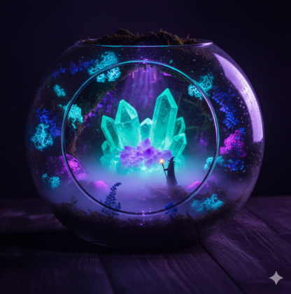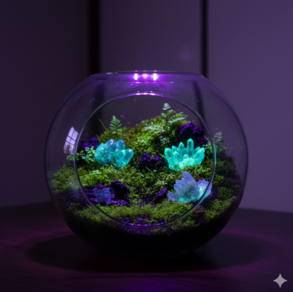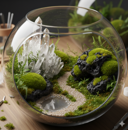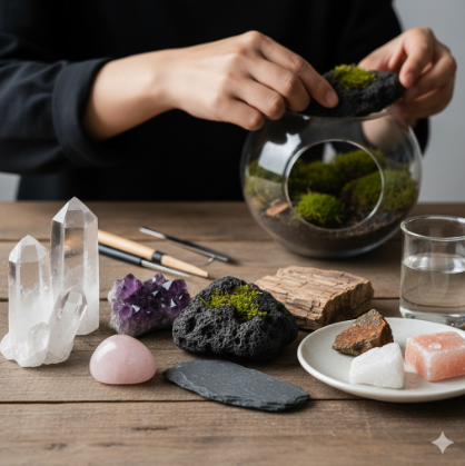 いつもの苔テラリウムに、鉱石という永遠の輝きを。お気に入りの水晶やパワーストーンを加え、ガラスの中にあなただけの物語を創造しませんか?石の選び方から世界観を深める配置のコツも