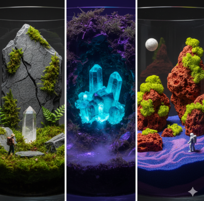 - 物語を引き出す演出のコツ:小さな宇宙飛行士や探査機のフィギュアを置くことで、一気にSFの世界観が立ち上がります。磨かれた球体の鉱物を空に浮かぶ月や惑星に見立てるのも、壮大な宇宙を感じさせるテクニックです。