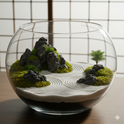 - 世界観を深める鉱石と苔:黒い溶岩石や落ち着いた色合いの石を「島」や「山」として大胆に配置します。苔は地面を覆うスナゴケなどを選び、白い化粧砂で水の流れ(砂紋)を描くことで、枯山水の世界観が完成します。