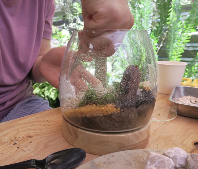 土を容器に入れたり、土の表面をならして傾斜を作ったりするのに使います。奥まった場所にも土を運びやすいよう、柄の長いパフェスプーンや、園芸用の土入れスプーン(小)があると便利です。